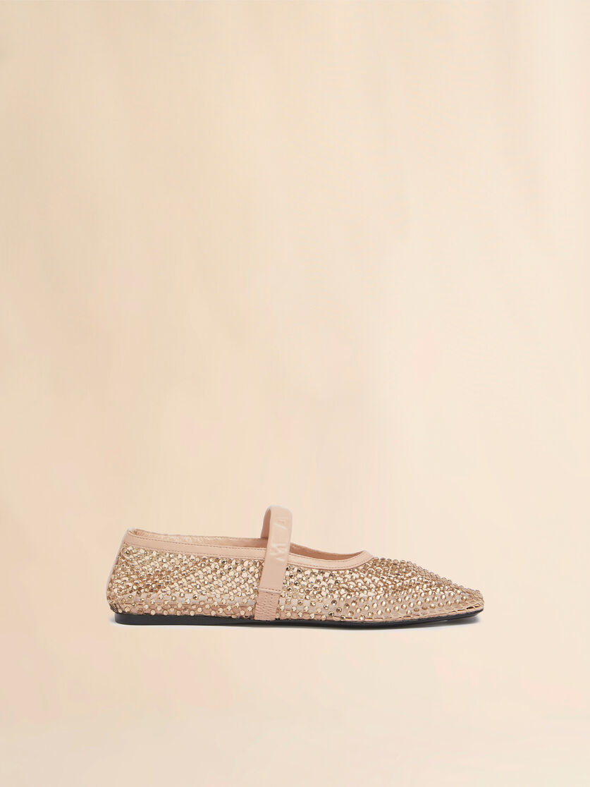 Mesh Mary Jane ballet shoe, encrusted with rhinestones. Square toe. Leather strap, detailed with embossed Marni lettering. Comes with a bag of replacement rhinestones.