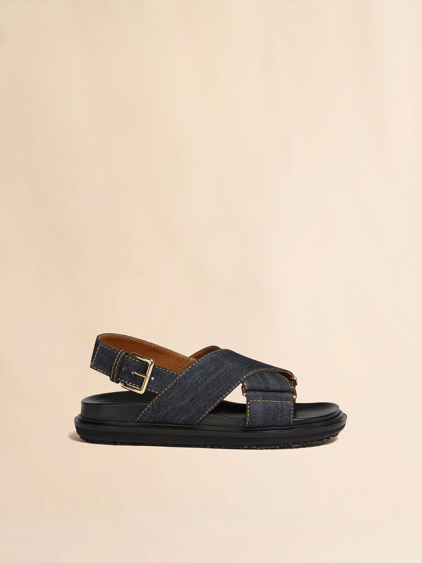 Iconic Fussbett crisscross sandal with rectangular rings and back strap with metal buckle. Gold hardware. Leather insole. Iconic sole in leather with a central layer in micro, outsole in jute.