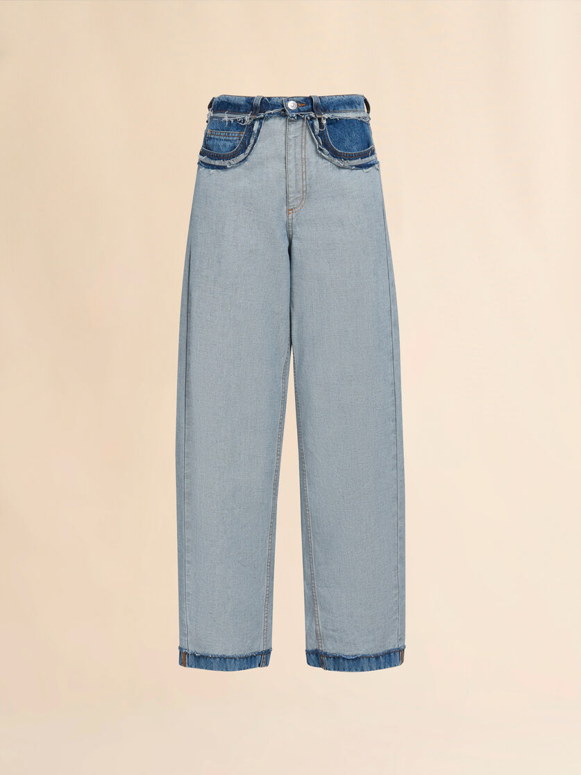 5-pocket jeans made from stonewashed organic bull denim. Inside out design with raw-cut edges at the waist and hip pockets. Carrot fit with low waist. Finished with embroidered Marni lettering on the back pocket and a leather logo patch.