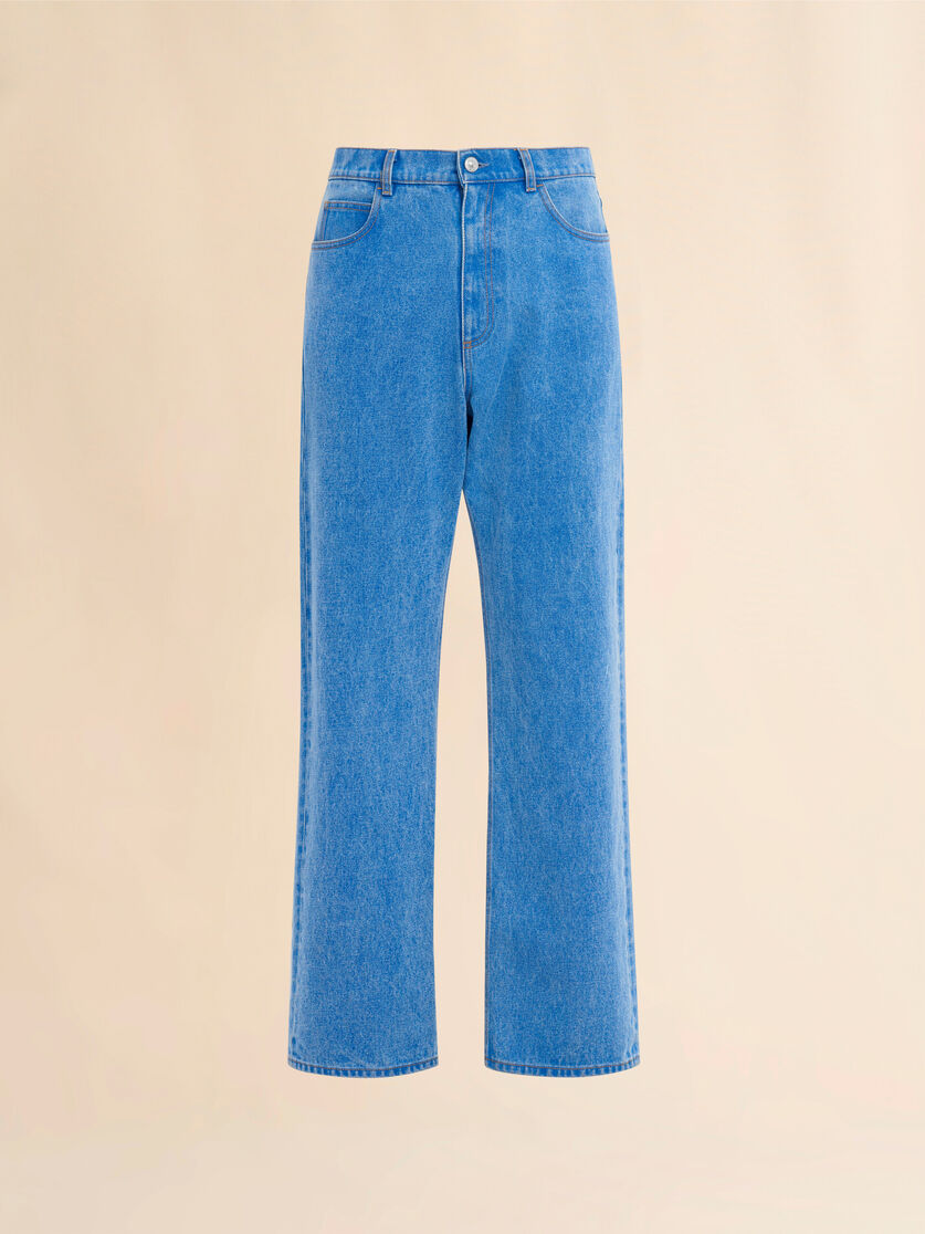 5-pocket jeans made from coated and stonewashed organic cotton denim. Relaxed mid-rise fit with wide leg. Button and zip fly. Leather patch with red Marni print on the back waist.