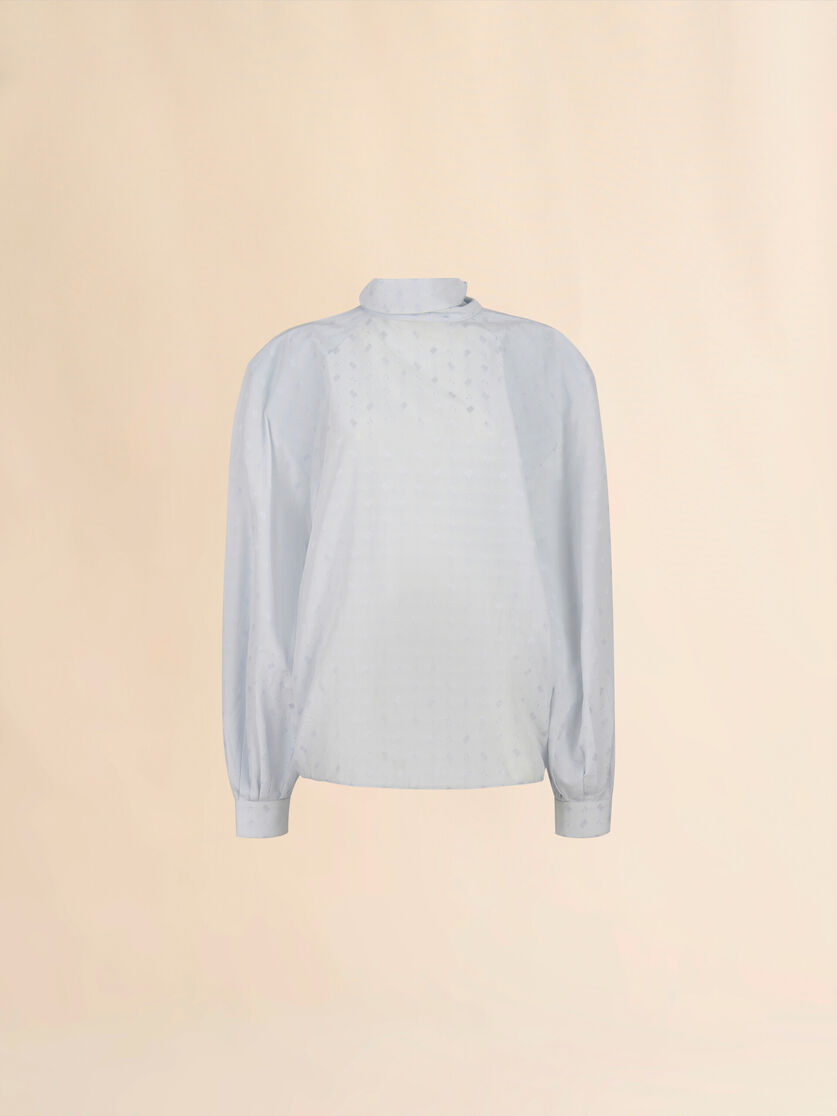 Fluid viscose-cotton top with geometric jacquard motif inspired by this season's openwork knit styles. Voluminous balloon silhouette with long raglan sleeves. High turnover neck with back button and oversized bow detail. Buttoned cuffs.