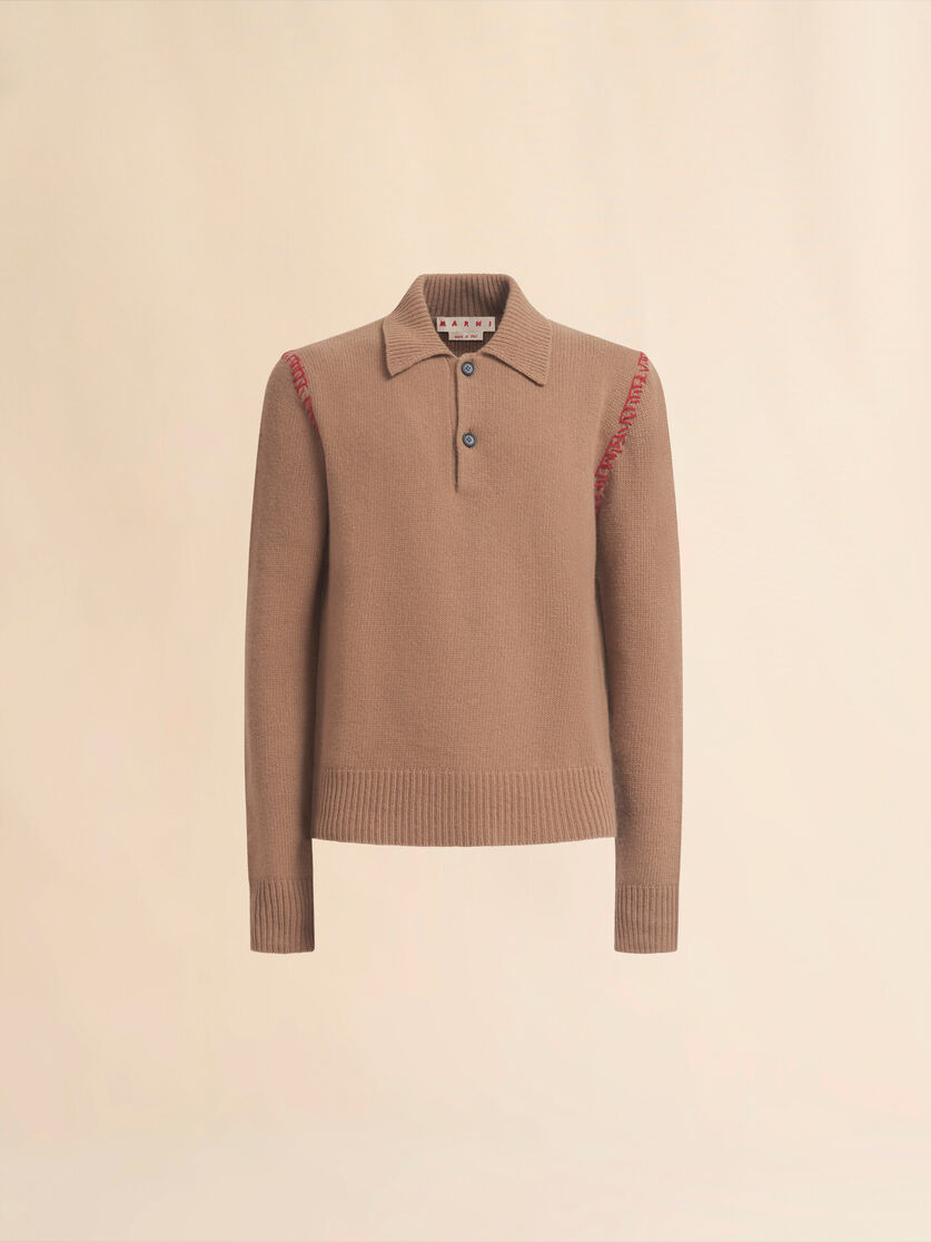 Long-sleeved jumper knitted from a blend of virgin wool and cashmere. Regular fit with polo collar and button placket. Hand-embellished with contrast Marni Mending stitches along the shoulders and armholes, and logo on the back neck.