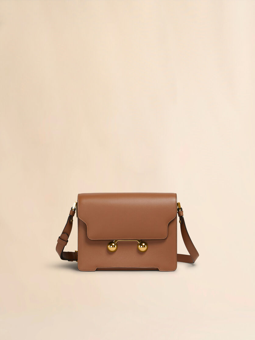 Trunkaroo medium rectangular shoulder bag crafted from calfskin leather. Front flap with magnetic closure, featuring engraved Marni lettering and oversized stud details. Contoured base on the front and back. One compartment with inside pocket. Lined in nappa leather. Detachable and adjustable buckled shoulder strap: can also be worn as a clutch.