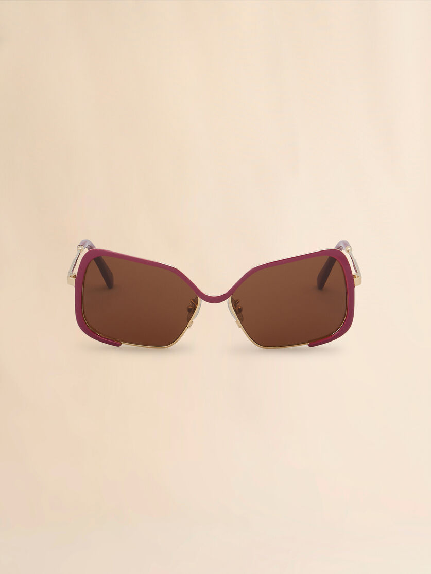 Unila sunglasses crafted from sleek metal. Constructed from a single rod forming a soft U-shaped nose bridge. Oversized geometric lenses. Flexible metal temples with coloured acetate tips.