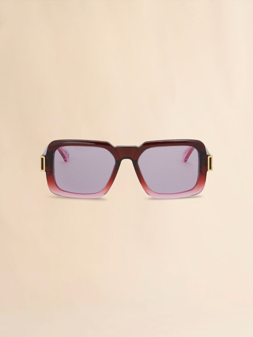 Zamalek sunglasses inspired by classic '70s styles, flaunting thick acetate rims. Large square lenses and sturdy nose bridge. Elevated with a custom-designed metal embellishment on the temple.