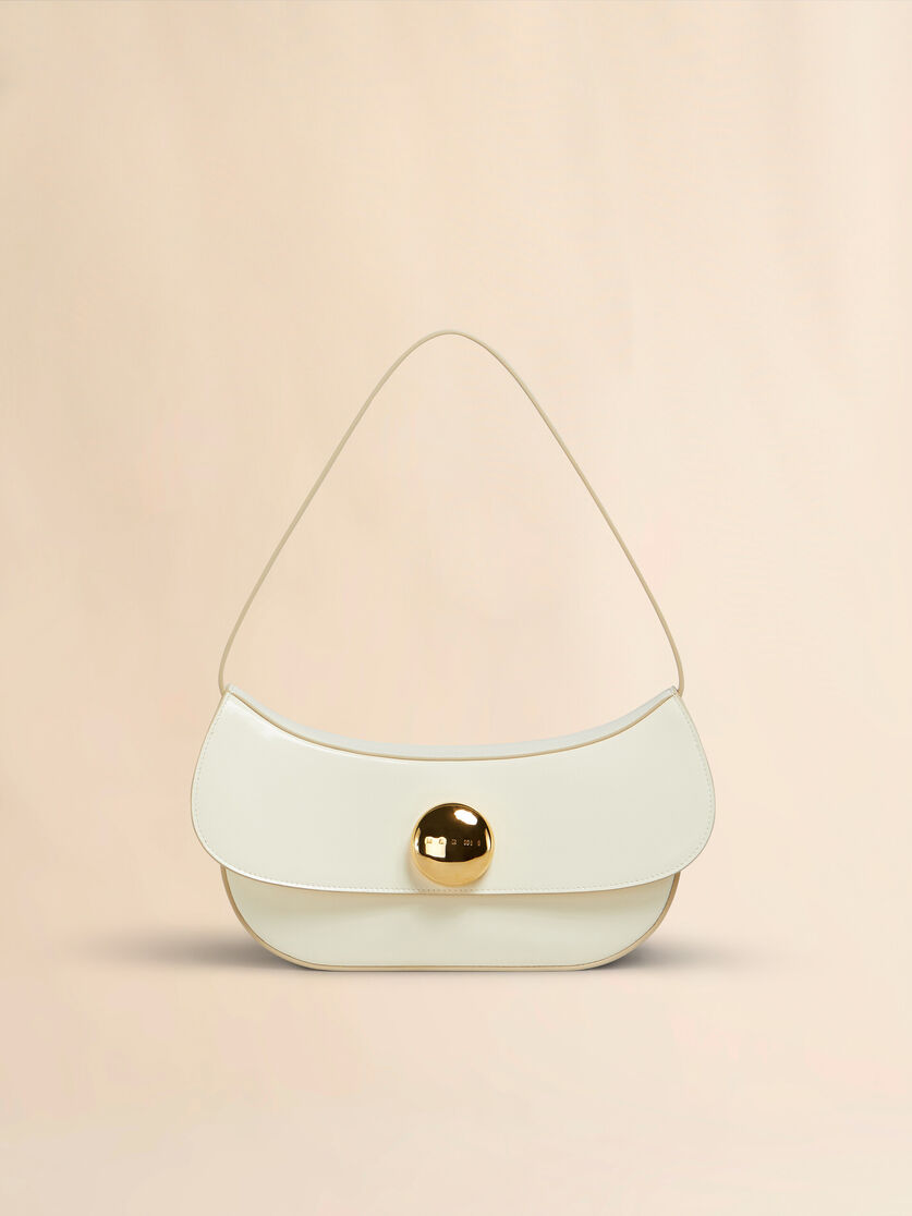 Butterfly hobo bag crafted from shiny brushed leather. Medium size. Semi-rigid design with harmonious curved silhouette. Maxi metal stud twist lock, engraved with Marni lettering. Suede lining and inside card slot.