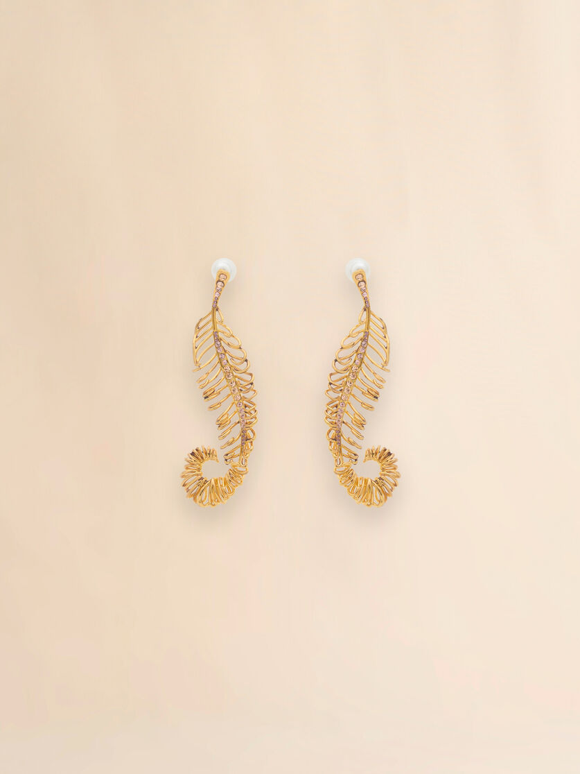 Oversized metal earrings, curved into the shape of feathers. Encrusted with two-tone coloured rhinestones down the centre.