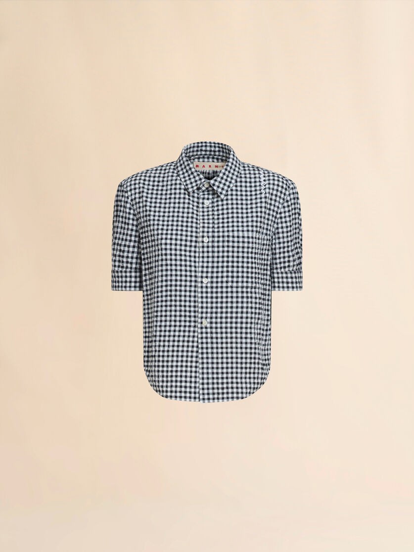Karohemd aus technischer Seersucker-Baumwolle mit kurzen Ärmeln, geknöpften Manschetten und abgerundetem Saum. Auf der linken Schulter ist ein Marni-Symbol von Hand aufgestickt.
