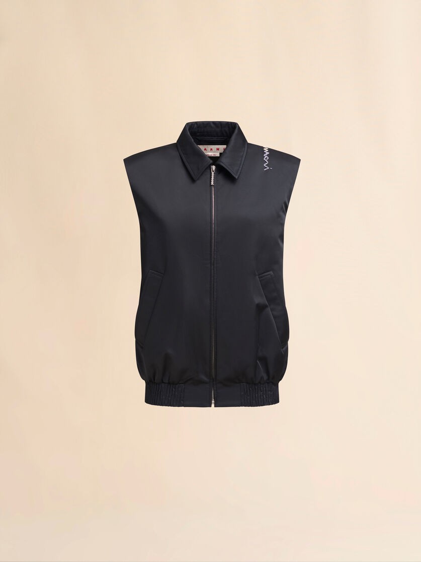 Kurze, ärmellose Bomberjacke aus wasserabweisendem Taft. Der lockere Schnitt zeichnet sich durch einen Hemdkragen, einen Reißverschluss vorne, diagonale Leistentaschen und einen elastischen Saum aus. Ein charakteristisches Marni-Symbol ist auf der linken Schulter handgestickt.