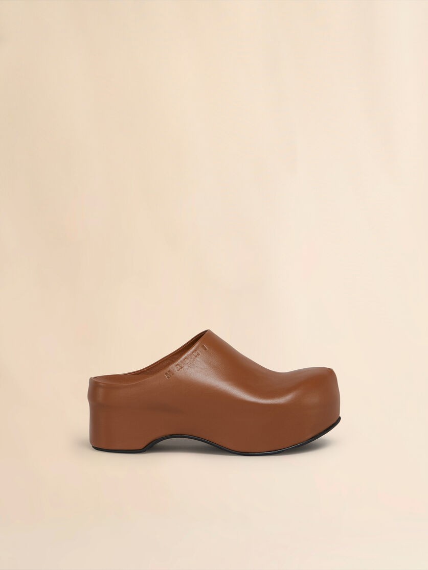 Klobiger Clog-Sabot mit leichter Plateausohle aus Holz, komplett mit glattem Nappaleder bezogen. Dezenter Marni-Schriftzug am Rand. Innensohle aus Leder und Laufsohle aus geripptem Gummi.