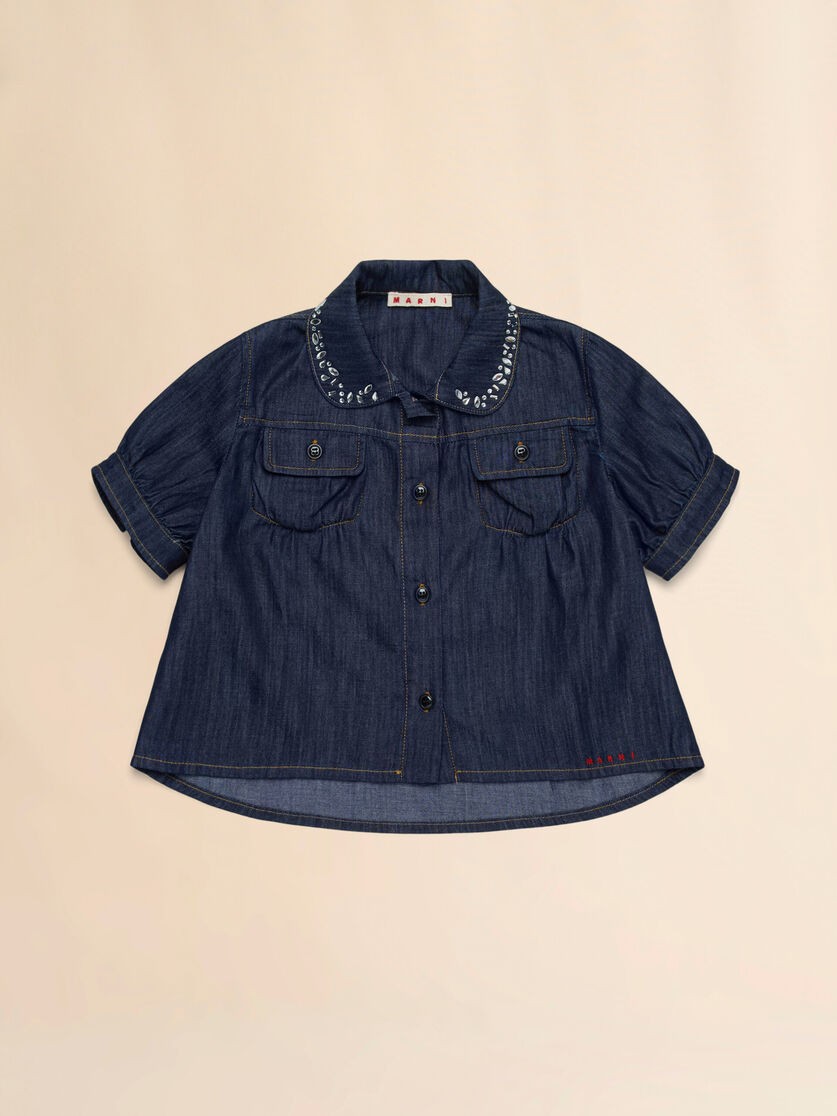 Kurzarmhemd aus hellem, dunklem Denim. Strasssteine am Kragen. Gesticktes Logo in Kontrastfarbe auf der Vorderseite. Vordertaschen. Farblich abgesetzte Nähte. Knopfverschluss vorne.