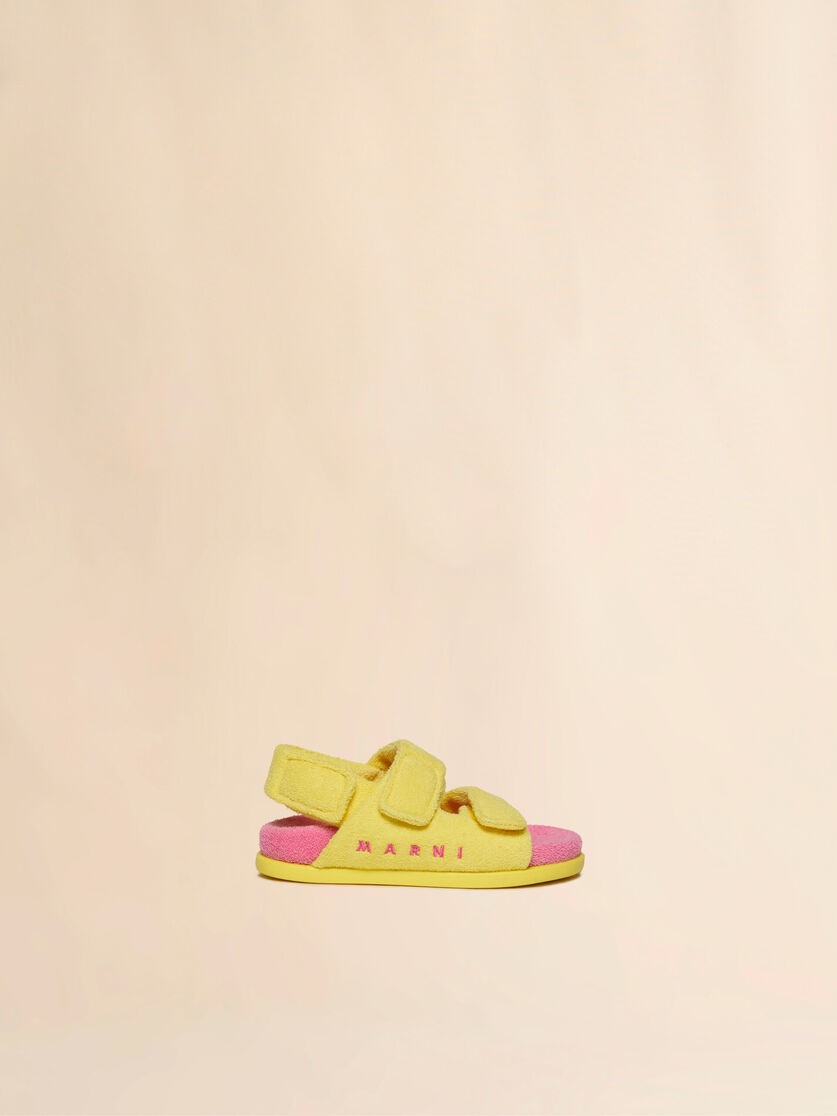 Fussbett-Sandale aus Frottee, Verschluss mit drei verstellbaren Klettverschlüssen. Zweifarbiges Design mit kontrastierender Innensohle und Gummilaufsohle. Gestickter Marni-Schriftzug an der Seite.