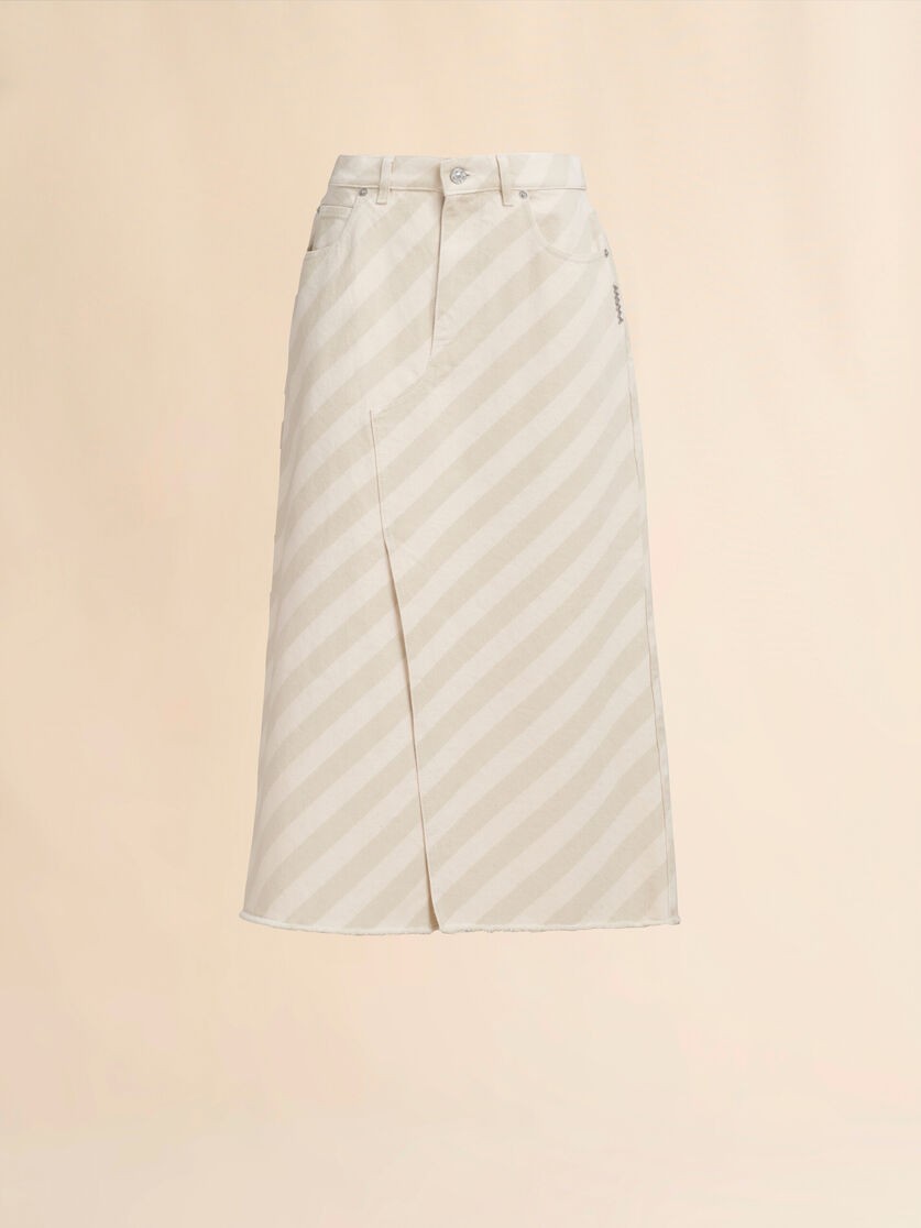 5-Pocket-Rock aus gewaschenem Baumwoll-Denim mit diagonalem Streifenmuster. Ausgestellte Silhouette mit asymmetrischem Mittelschlitz vorne und hinten. Halbhohe Taille und offener Schnitt unten. Reißverschluss und Knopfverschluss. Abgerundet mit einem Lederetikett mit rotem Marni-Aufdruck hinten an der Taille und seitlichem Marni-Schriftzug aus Metall.