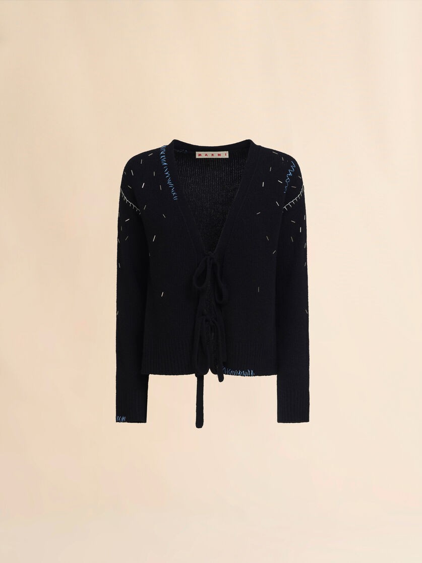 Langärmlige Strickjacke aus Woll- und Kaschmirmischung, verziert mit farbigen Perlen und Stickereien. Bänder zum Binden vorn und ein handgesticktes Marni-Symbol auf der linken Schulter.