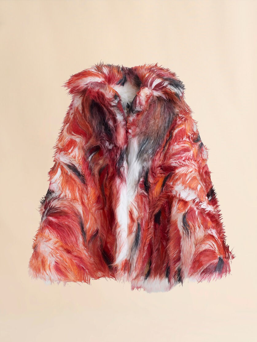 Kurzer, einreihiger Mantel aus Langhaarstoff, komplett handbemalt. Weite und ausgestellte Silhouette. Knopfverschluss vorne.