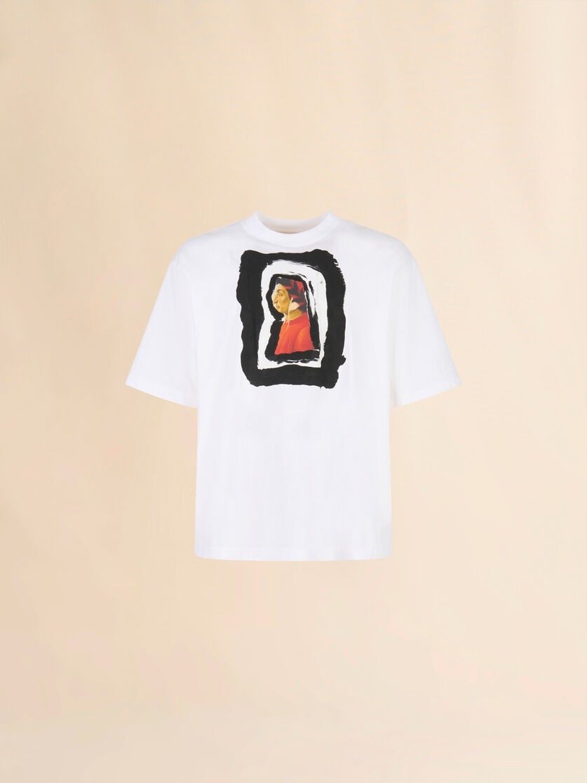 T-Shirt mit entspannter Passform aus Bio-Baumwolljersey. Rundhalsausschnitt und kurze Ärmel. Digitaler Dante-Druck mit Siebdruckrahmen, veredelt mit gemalten Details für einen strukturierten Look, der an herausgerissene und übermalte Seiten erinnert, wie sie bei der Marni Fashion Show zu sehen waren.