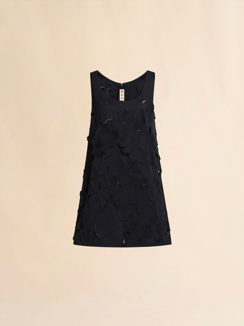 Sleeveless duchess satin dress with 3D cut out flower embellishment. The flared silhouette has a scoop neck and a tonal zip at the back. Tonal slip dress included.