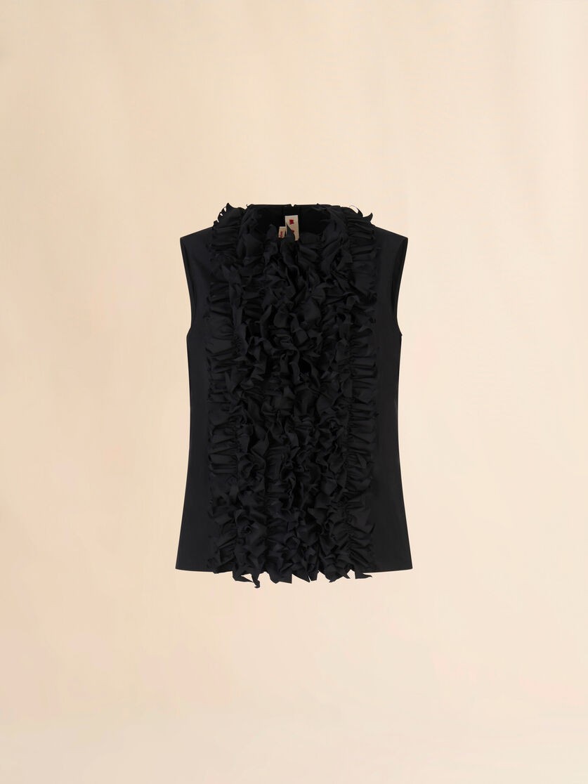 Barr gan muinchillí déanta as poplin cadáis orgánaigh éadrom. Rufailí gearrtha de láimh i dton ar an tosaigh. Gearradh díreach le muineál criú. Dúnadh zip dofheicthe ar chúl.