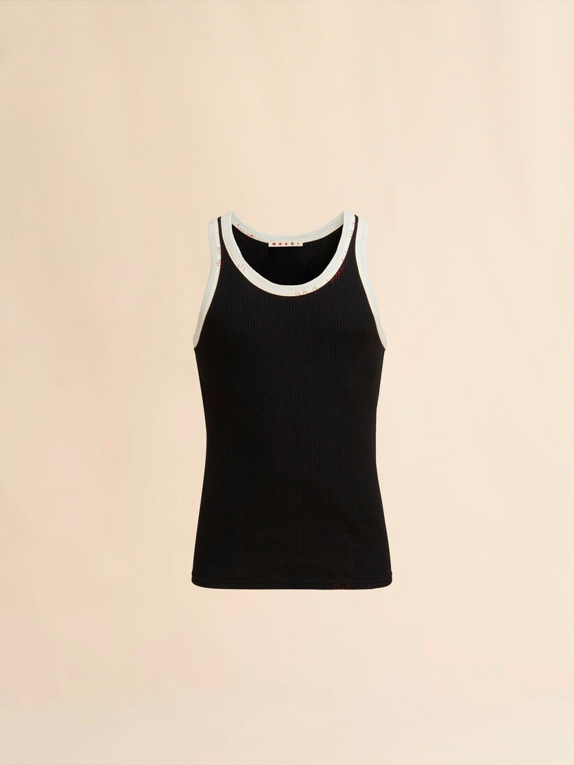Barr umar feistithe déanta as geansaí cadáis easnacha le síneadh. Muineál cruinn leathan agus strapaí codarsnacha. Maisithe de láimh le greamanna Marni Mending agus lógó feadh na n-imeall.