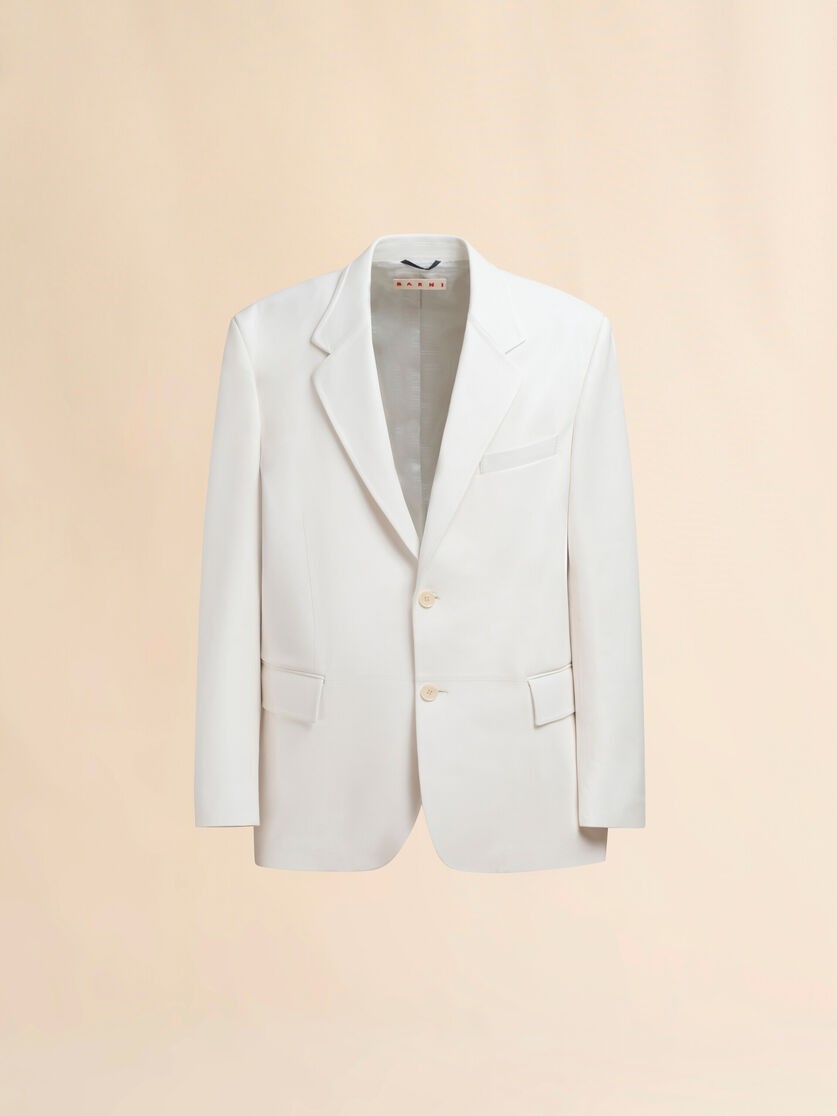 Blaiséir aonchíoch déanta as nappa bog im. Feistiú boscach le póca cófra agus pócaí flap. Líneáilte. Dúnadh cnaipe. Críochnaithe ar chúl le poll lárnach agus lipéad leathair le lógó Marni cabhraithe.