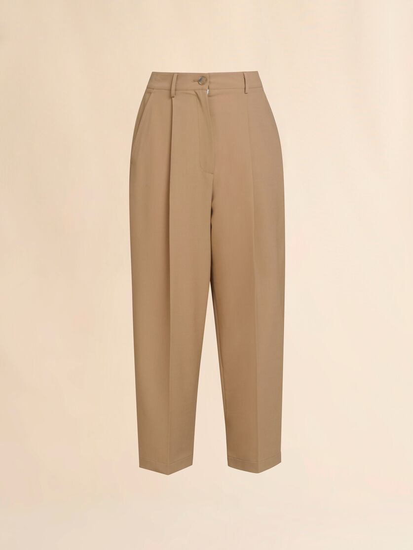 Brístí measctha olann éadroma gearrtha go feistiú suaimhneach le cos beagán barrchaolaithe, coim rialta, agus dartanna ar an tosaigh. Pócaí taobh agus pócaí welt ar chúl. Gearr ag an rúitín, lúba crios ag an gcoim, agus zip taobh. Dúnadh zip agus cnaipe lárnach. Críochnaithe le Siombail Marni bróidnithe de láimh ar an taobh.