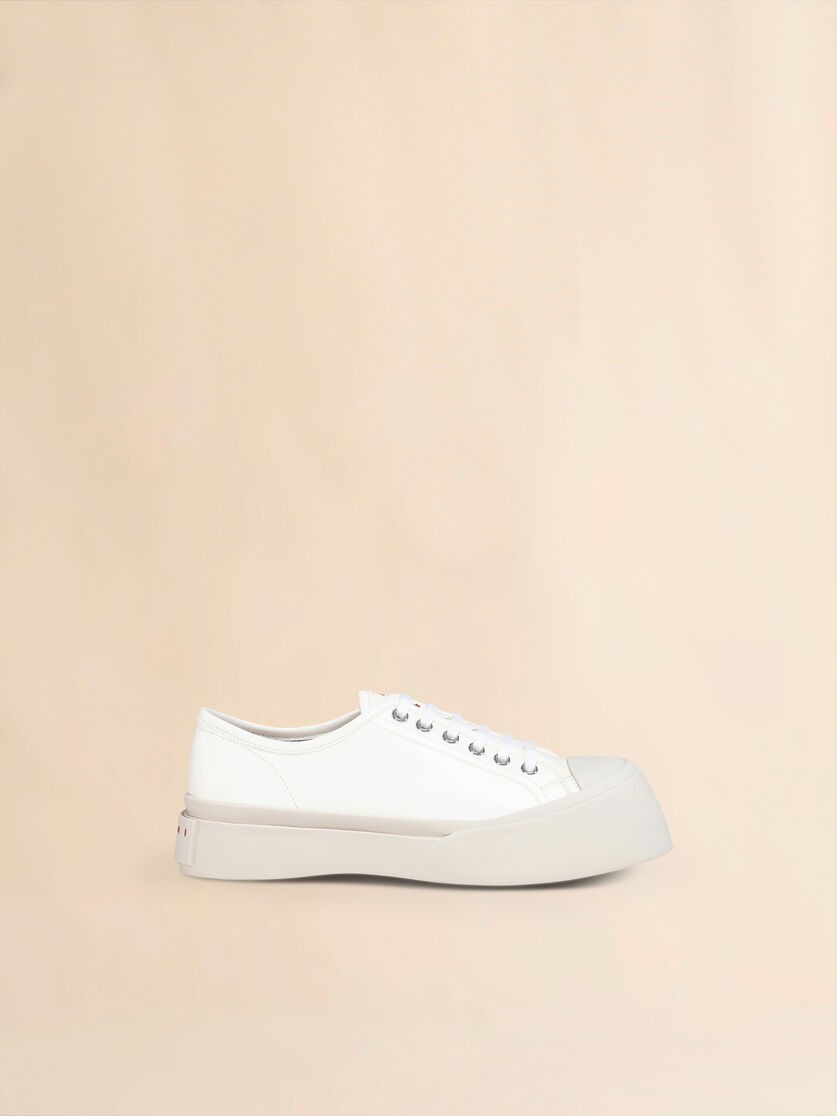 Bróga Pablo le lása íseal déanta as leathar nappa agus strap. Líneáil leathair. Bonn istigh bog leathair. Bonn ardáin thiubh déanta as rubar le lógó Marni ar a chúl.
