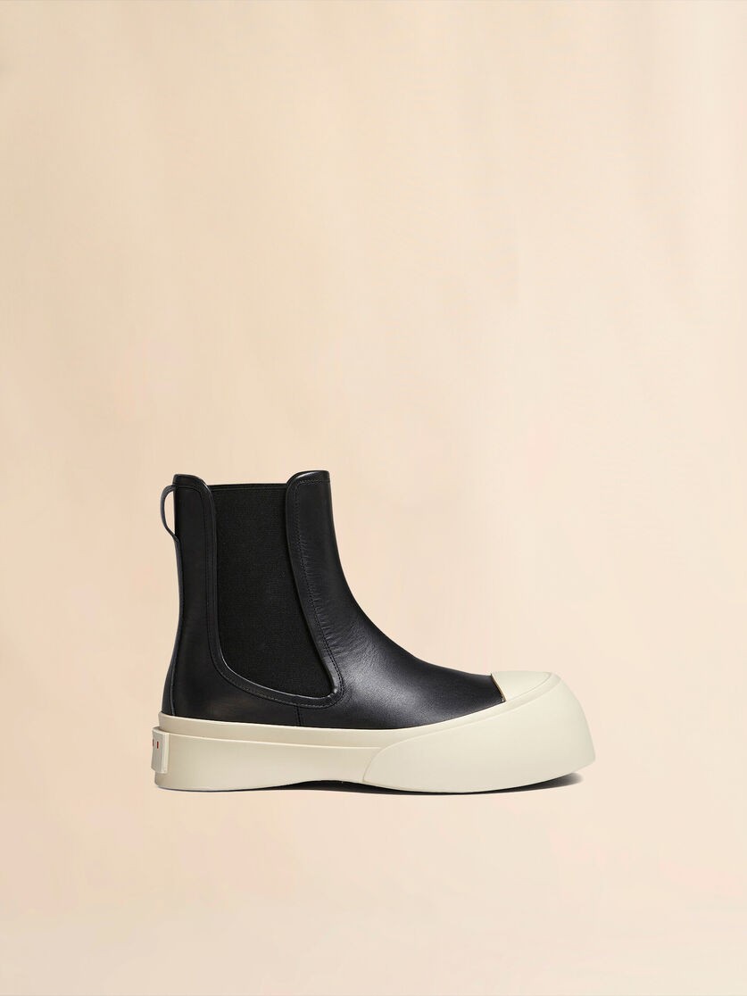 Buataisí Chelsea Pablo déanta as leathar nappa le taobhanna leaisteacha. Líneáil leathair. Bonn istigh bog leathair. Bonn ardáin thiubh déanta as rubar le lógó Marni ar a chúl.
