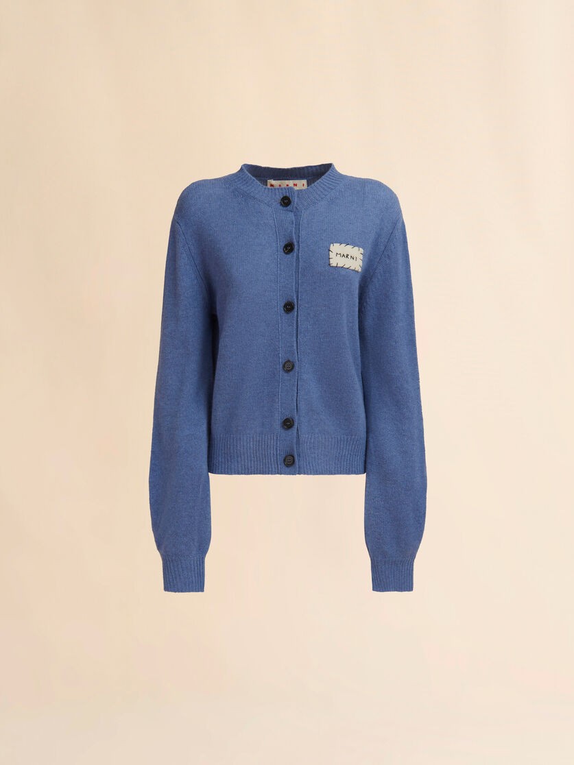 Cairdeagán muinchille fada cniotáilte as caismír íon. Feistiú rialta le muinchillí balún agus muineál cruinn. Maisithe de láimh le paiste lógó deisiúcháin Marni ar an gcliabhrach.