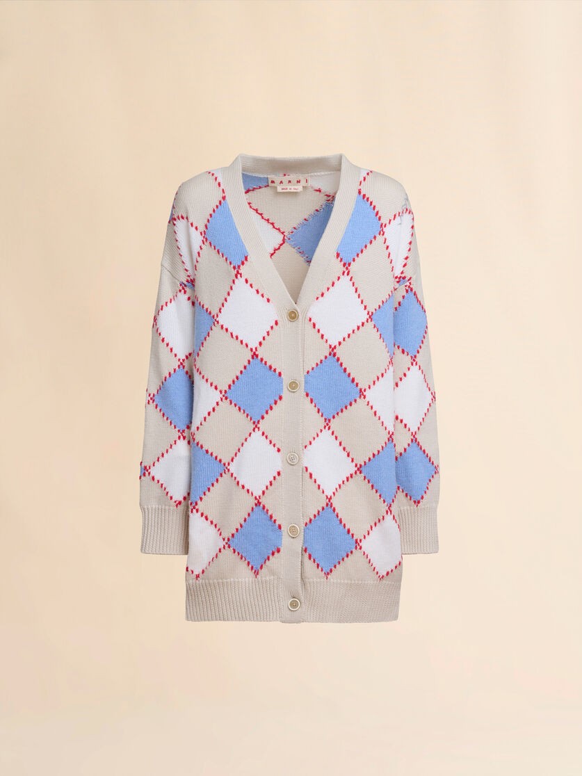 Cairdeagán clasaiceach argyle déanta as olann íon, le feistiú rómhór, muinchillí fada agus muineál V. Imlínte ribeacha, cnaipe chun tosaigh, agus Siombail Marni bróidnithe de láimh ar an ngualainn chlé.