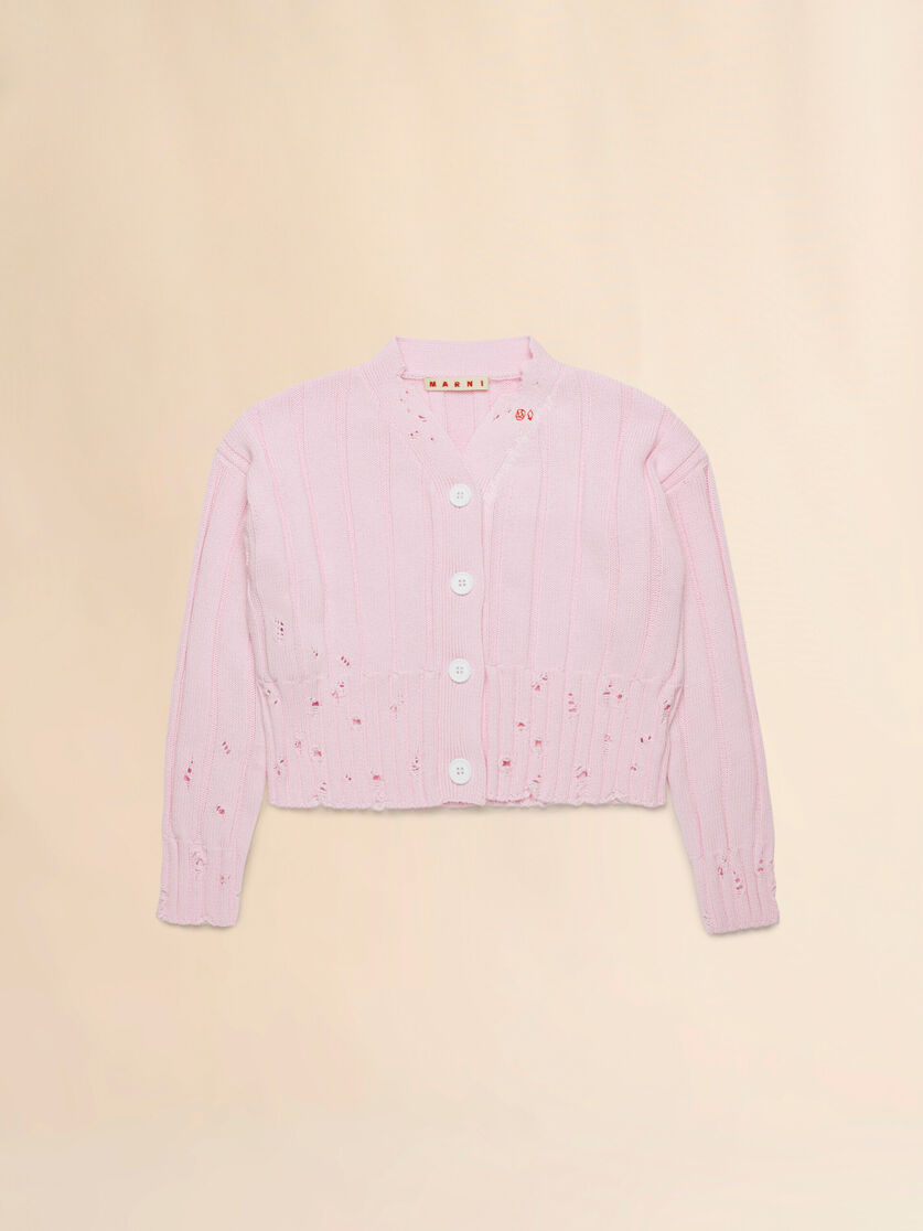 Cairdigan cniotáilte ribeach le muinchille fada agus stróicthe áitiúla. Lógó Marni Flower i ndath codarsnach ar an gcoiléar. Dúnadh cnaipe tosaigh.