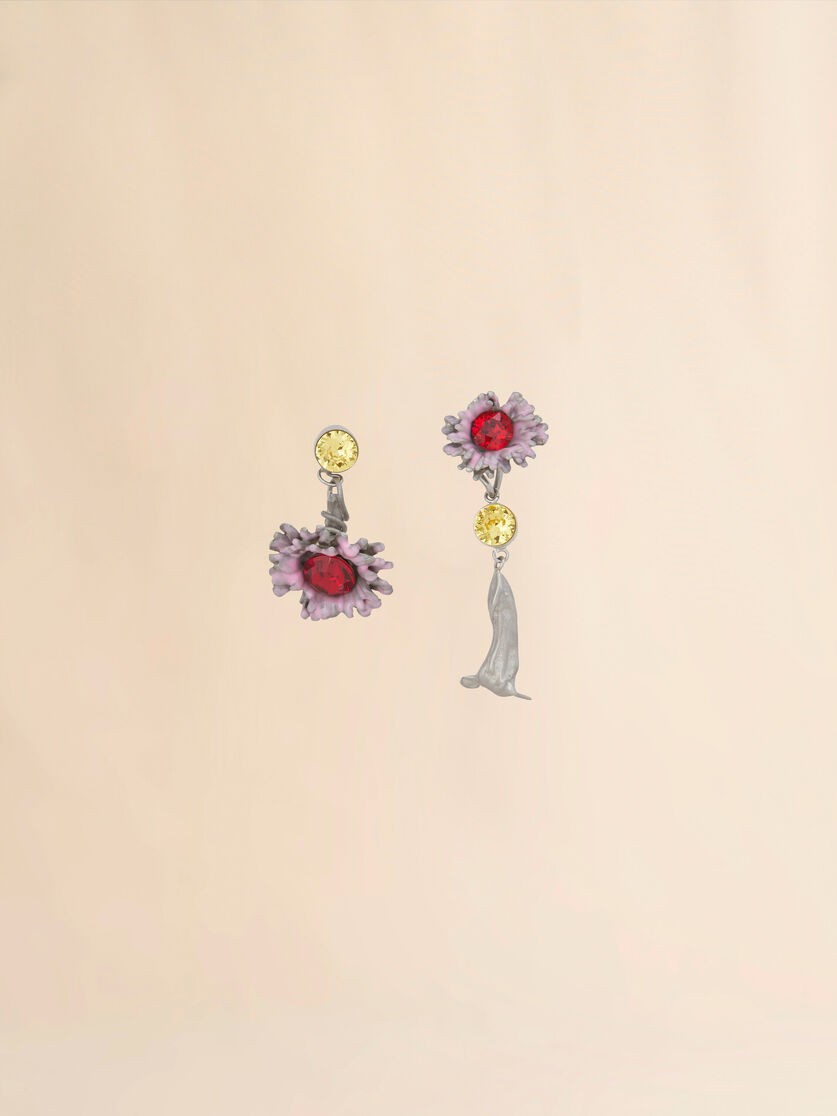 Cluaise neamhshiméadracha Flower Pop i miotal cruanta. Mionsonraí cruth bláthanna le criostail agus crochadán braoin neamhrialta. Dúnadh poist.