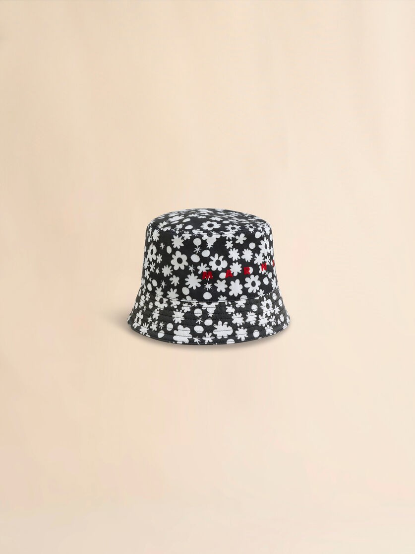 Hata buicéad cadáis twill le móitíf Pop Fields priontáilte ar fud. Críochnaithe le scríbhneoireacht chodarsnachta Marni bróidnithe ar an tosaigh. Líneáil cadáis.