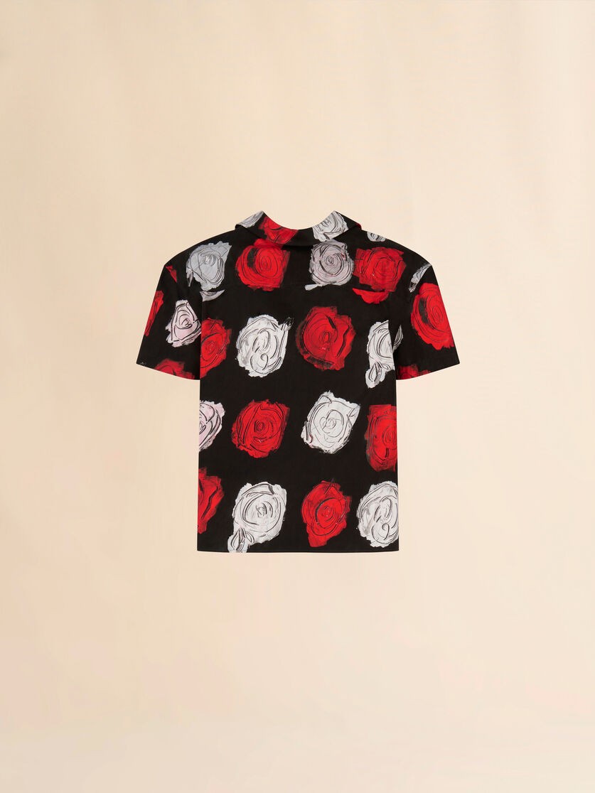 Léine babhlála gearr-mhuinchille déanta as poplin cadáis le mothú trom, dlúth. Priontáilte le móitíf rós bán agus dearg Mercury an tséasúir seo, cruthaithe ag baint úsáide as teicníc scríobtha speisialta ar phéint fhliuch. Feistiú rialta le póca cófra. Dúnadh cnaipe.