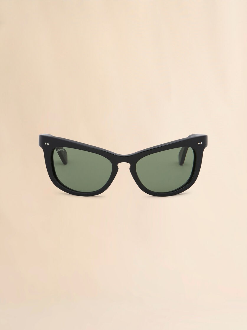 Spéaclaí gréine Isamu déanta as aicéatáit thiubh. Cur i láthair nuálach ar scáthchruthanna clasaiceacha na 1950idí, le líne mhalaí V-chruthach sínte amach anseo. Lionsaí glasa.