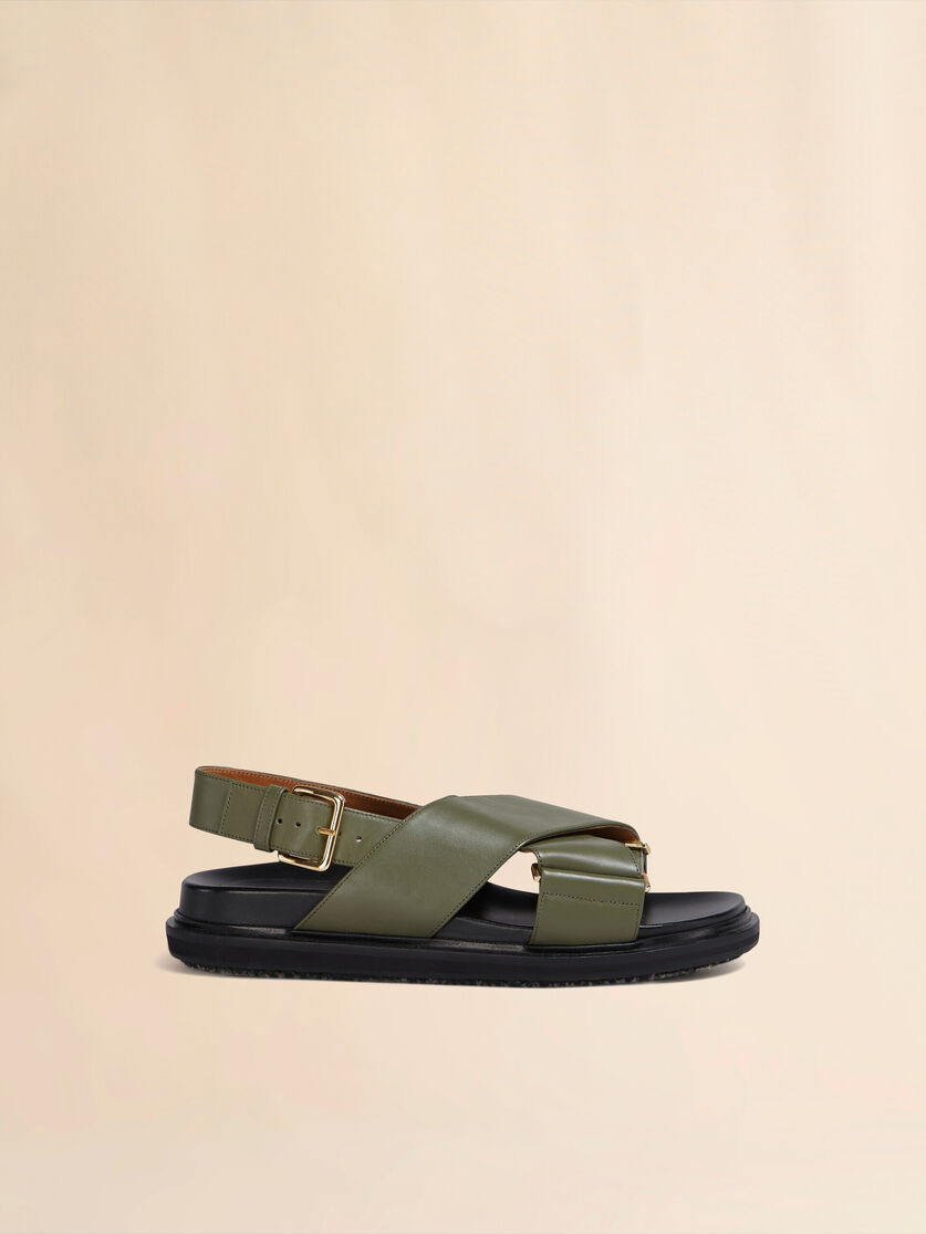 Sandail trasnánacha íocónacha Fussbett i leathar lao réidh le fáinní dronuilleogacha agus strap cúil le búcla miotail. Crua-earraí óir. Bonn istigh leathair. Bonn íocónach i leathar le micrea-chiseal lárnach, bonn seachtrach i siúit.