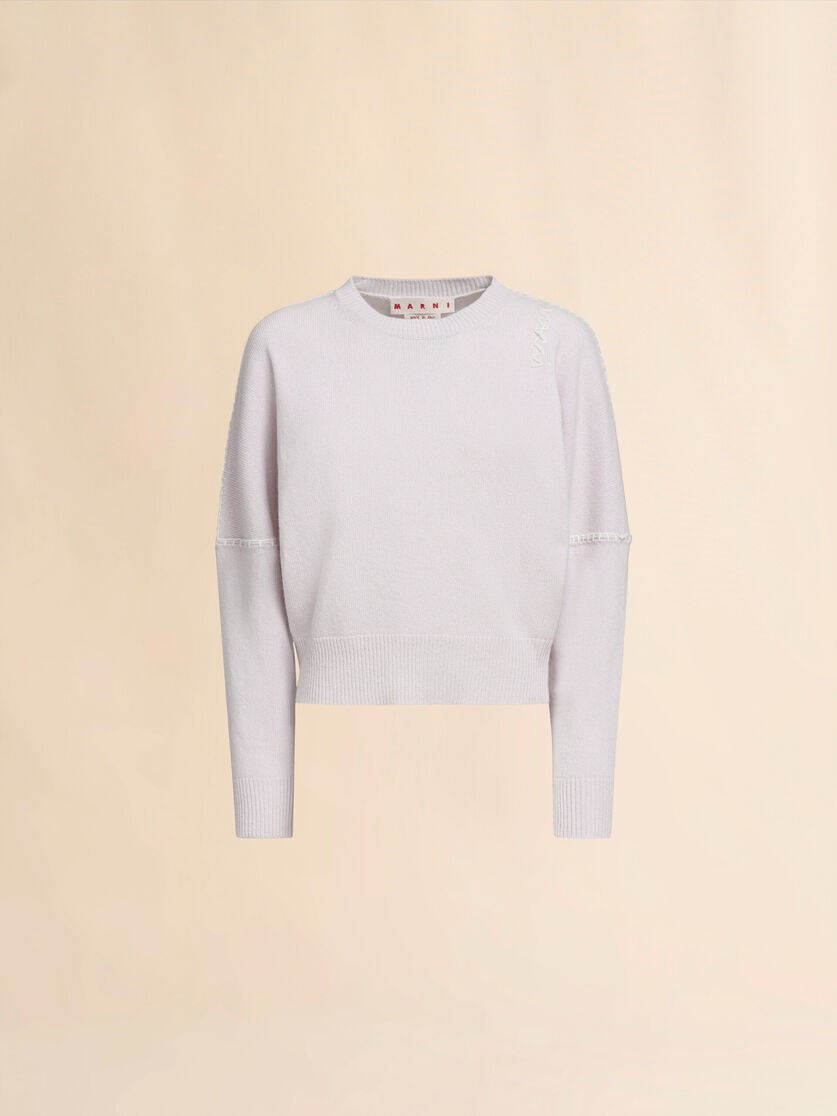 Geansaí gearrtha déanta as olann íon agus caismír le muinchillí fada agus imeallacha cniotáilte ribeacha. Tá an Siombail Marni sínithe bróidnithe de láimh ar an ngualainn chlé.