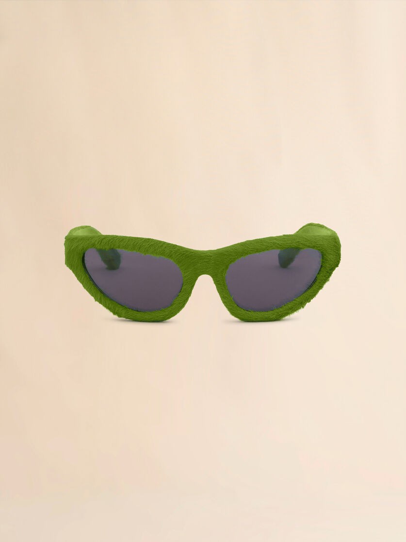 Spéaclaí gréine Mavericks le cruth maisc cuartha déanta as aicéatáit, clúdaithe le leathar clúmhach. Teampaill le lógó Marni. Lionsaí dubha.