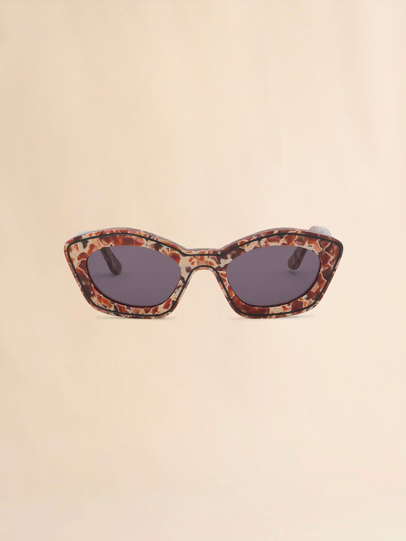 Spéaclaí gréine Kea Island, déanta as aicéatáit le bailchríoch phatrúnach scagtha atá spreagtha ag an nádúr. Scáthchruth súile cat thar a bheith chic. Baileoga níolóin codarsnachta ar an tosaigh agus na teampaill. Maisithe le litreacha miotail óir Marni.