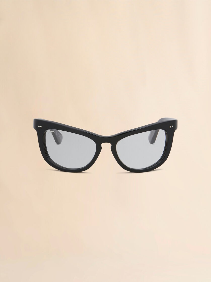 Spéaclaí optúla Isamu le himill thiubha aicéatáite. Léirmhíniú nuálach ar scáthchruthanna clasaiceacha na 1950idí, ag taispeáint líne mhalaí sínte V-chruthach le haghaidh cuma todhchaíoch. Lionsaí PMMA soiléire.