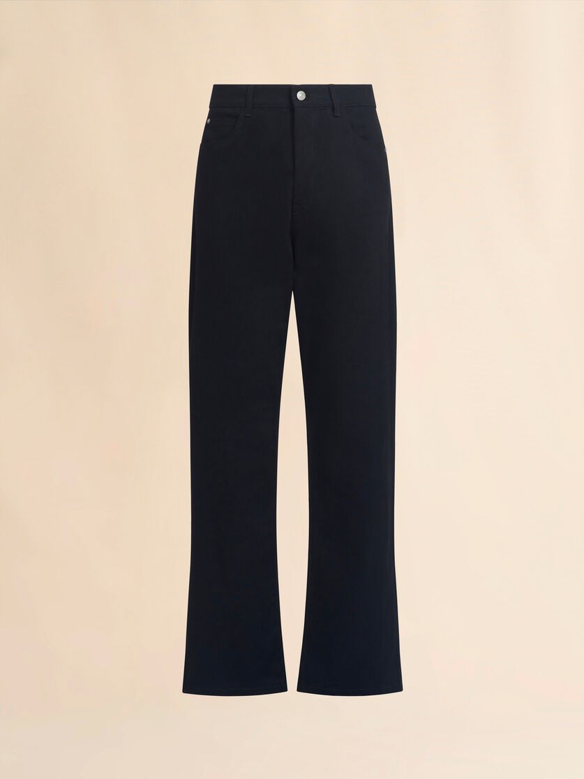 Jeans cúig phóca déanta as dénim éadrom ruaimnithe le snáth. Cos leathan agus meán-ardú. Clúdach le cnaipe agus zip. Paiste lógó leathair ar chúl.