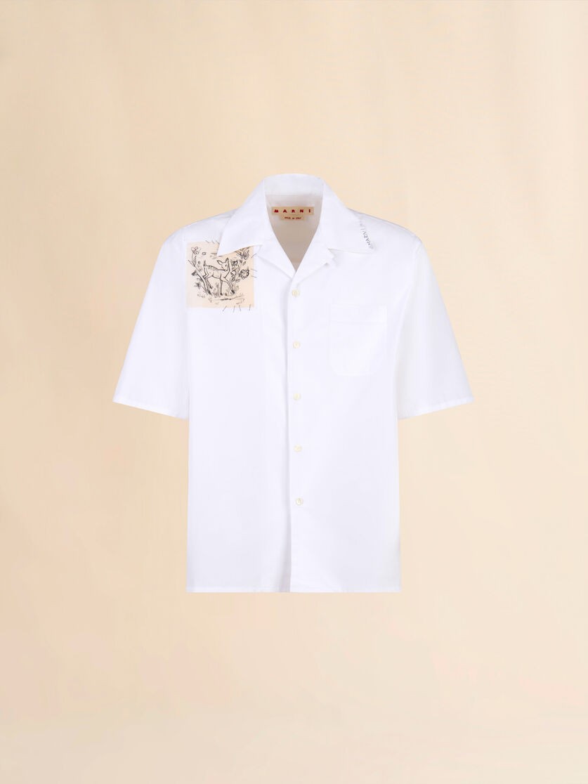 Léine bhabhlála gearr-mhuinchille déanta as poplin cadáis orgánaigh. Priontáilte le paiste donn leanbh péinteáilte ar an ngualainn, agus imeall le greamanna Marni Mending. Lógó Marni Mending ar an gcoiléar. Feistiú boscach le póca cófra. Dúnadh cnaipe. Is féidir í a chaitheamh le coiléar babhlála nó dúnta go hiomlán.
