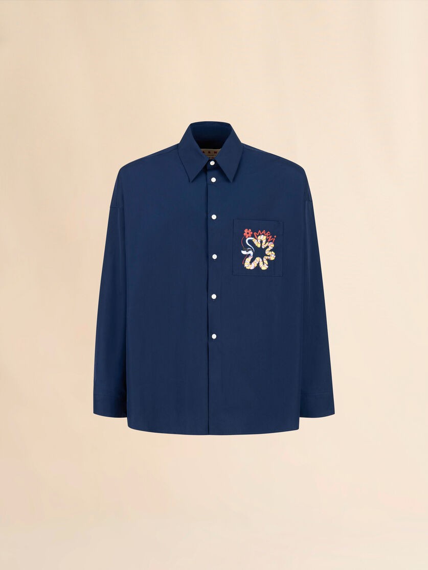 Léine muinchille fhada déanta as cadás íon. Feistiú boscach le dúnadh cnaipe agus cufaí cnaipe. Póca cófra le prionta nathrach.