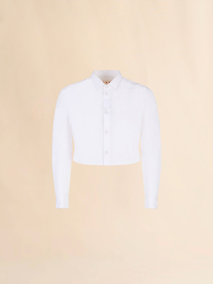Léine fhada muinchille déanta as poplin cadáis orgánaigh. Feistiú caol. Cnaipí clúdaithe. Siombail Marni fuaite de láimh i snáth tonúil ar an ngualainn chlé.