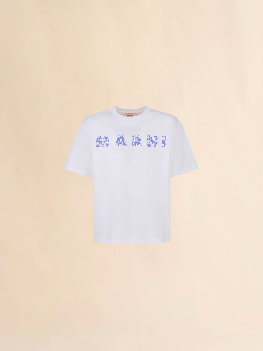 Léine T cadáis bhog geansaí gearrtha boscaí le muineál criú agus muinchillí gearra. Litriú Marni i bpatrún Pop Fields priontáilte ar an tosaigh.