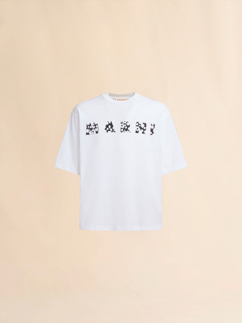 Léine cadáis geansaí gearrtha go feistiú suaimhneach le muineál cruinn agus muinchillí gearra. Críochnaithe le lógó Pop Fields filled Marni trasna an chliabhraigh.