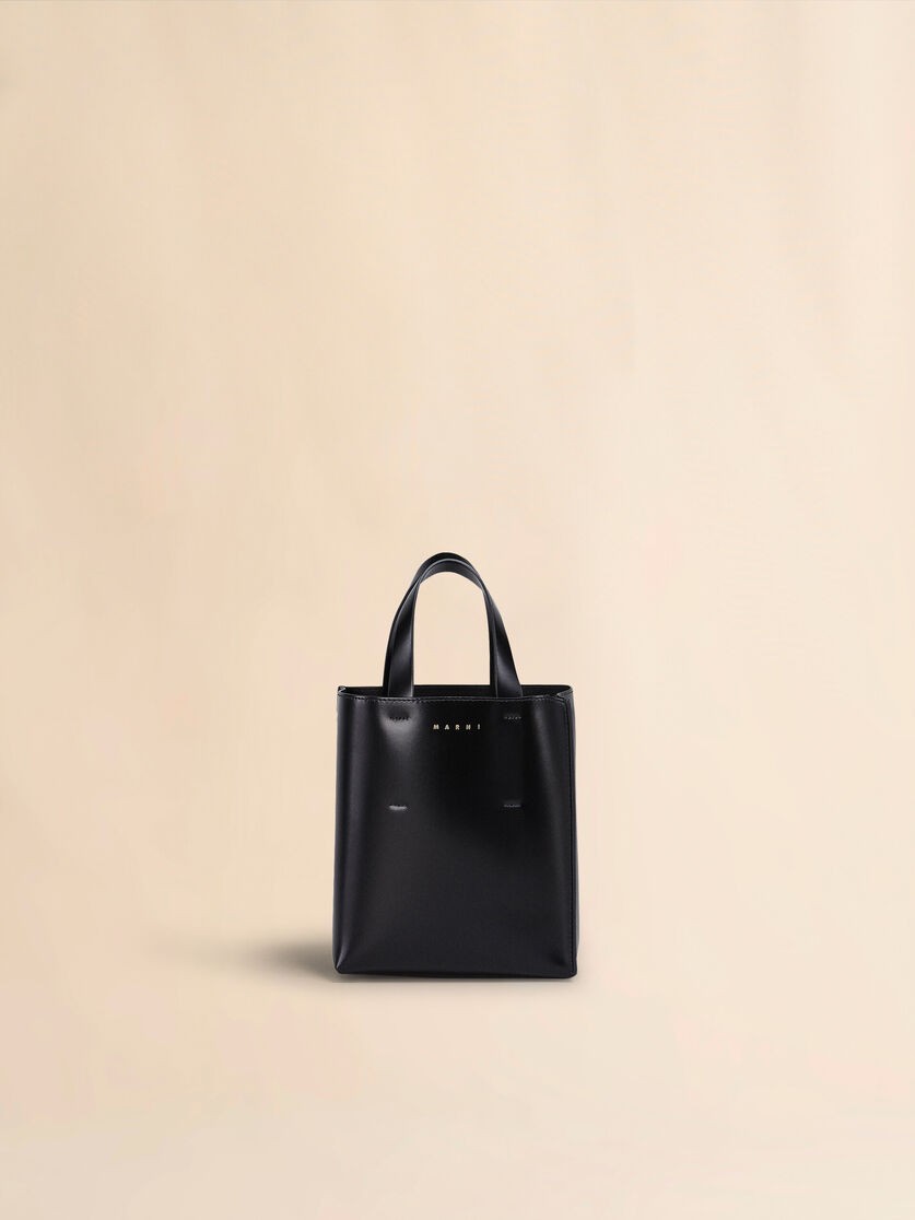 Mála tote Thuaidh/Theas, méid beag, déanta as leathar lao le póca sliotán inmheánach. Mála tarraingthe fabraice istigh. Láimhseálacha barr leathair agus strap ghualainn inscortha, inchoigeartaithe le búcla. Dearadh bloc-daite. Crua-earraí óir. Lógó priontáilte óir ar an taobh amuigh.