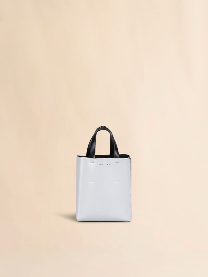 Mála tote Thuaidh/Theas, méid beag, déanta as leathar lao le póca sliotán inmheánach. Mála tarraingthe fabraice istigh. Láimhseálacha barr leathair agus strap ghualainn inscortha, inchoigeartaithe le búcla. Dearadh bloc-daite. Crua-earraí óir. Lógó priontáilte óir ar an taobh amuigh.