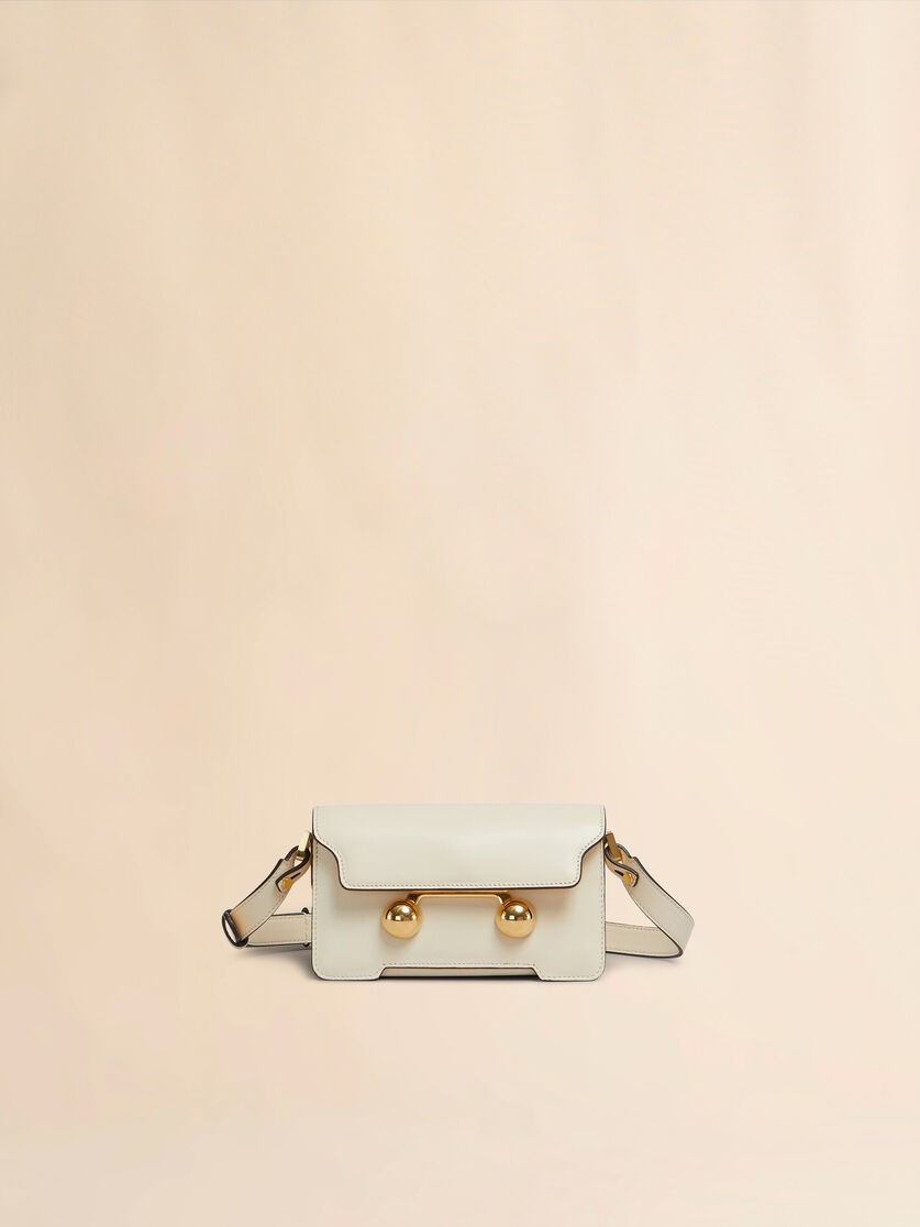 Mála gualainn beag dronuilleogach Trunkaroo déanta as leathar lao. Flap tosaigh le dúnadh maighnéadach, le litreacha Marni greanta agus sonraí stodaí rómhóra. Bonn comhrianta ar an tosaigh agus ar chúl. Urrann amháin le póca istigh. Líneáilte le leathar nappa. Strap gualainn búcla inscortha agus inchoigeartaithe: is féidir é a chaitheamh mar chluas freisin.