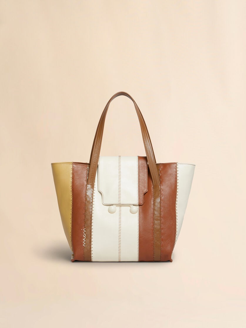 Mála siopadóireachta Trunkaroo déanta as leathar lao. Cruth meánach traipéise. Dearadh paiste le láimhseálacha leathair. Líneáil fabraice agus póca inmheánach. Dúnadh zip agus flapa tosaigh maighnéadach rómhór. Críochnaithe le fuála codarsnachta agus Siombail Marni bróidnithe de láimh ar an tosaigh.