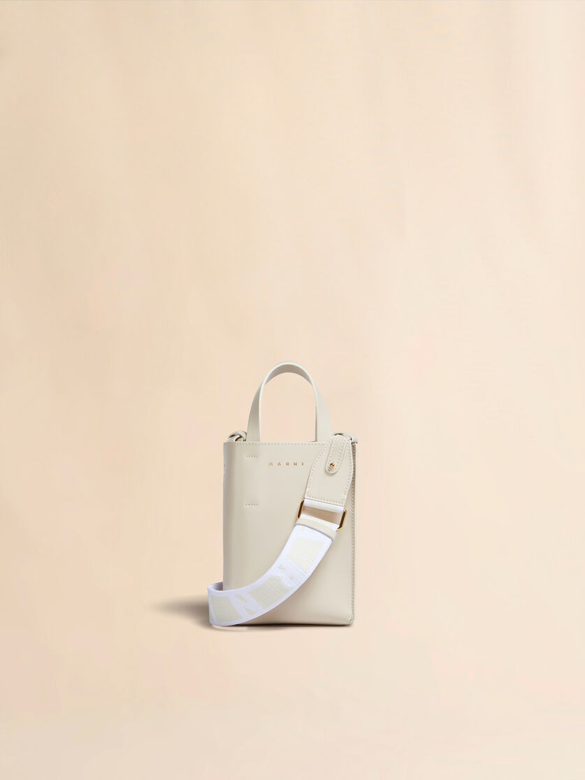 Mála tote Thuaidh/Theas, méid nano, déanta as leathar lao le póca sliotán inmheánach. Láimhseálacha leathair ar bharr an tseomra. Strap ghualainn téip athchúrsáilte inscortha agus inchoigeartaithe le litreacha Marni. Crua-earraí óir. Lógó priontáilte óir ar an taobh amuigh. Déanta san Iodáil.